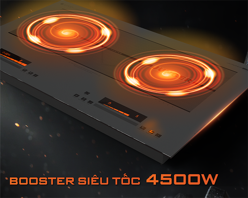 Mỗi vùng nấu vận hành ổn định ở mức công suất tiêu chuẩn 2000W và có thể tăng cường lên 2300W (vùng phải) và 2200W (vùng trái) khi kích hoạt tính năng Booster siêu tốc, đáp ứng nhanh các món cần nhiệt lớn và ổn định như đun sôi, xào hay áp chảo.