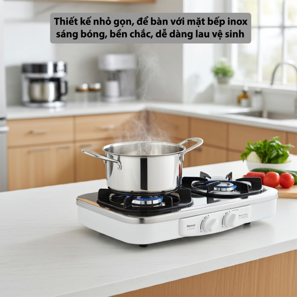 – Mặt bếp gas Rinnai RJ-554S(SV) được làm từ thép không gỉ có độ sáng bóng, chịu nhiệt tốt, muốn giữ bếp gas luôn sạch sẽ phải thường xuyên vệ sinh mặt bếp sau khi nấu nướng.