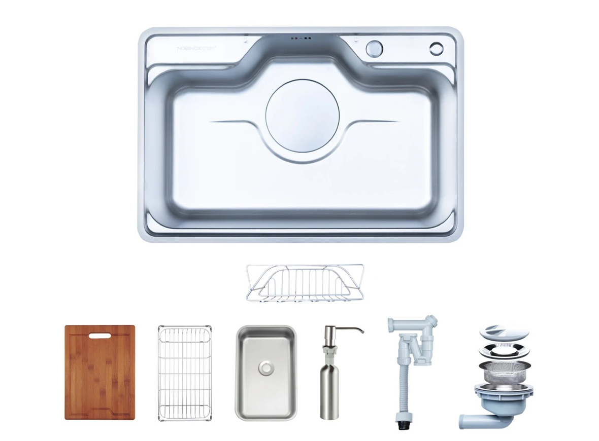 Nobinox LIKEN NL725D được trang bị thêm bộ phụ kiện bao gồm thớt tre, rổ inox, khay inox và bình đựng nước rửa bát, mang đến giải pháp toàn diện cho mọi nhu cầu sử dụng. Thớt tre với chất liệu tự nhiên, an toàn vệ sinh, cho phép bạn sơ chế thực phẩm trực tiếp trên bồn rửa một cách tiện lợi. Bộ rổ và khay inox đa năng giúp phân loại đồ dùng, ngâm rửa rau củ hay bảo quản chén bát khô ráo. Đặc biệt, bình đựng nước rửa bát được thiết kế thông minh, dễ dàng lắp đặt và sử dụng, giúp không gian bếp gọn gàng và chuyên nghiệp. Với bộ phụ kiện đi kèm này, mọi thao tác trong bếp trở nên nhanh chóng, hiệu quả và đầy đủ tiện nghi, mang đến trải nghiệm hoàn hảo cho người nội trợ.