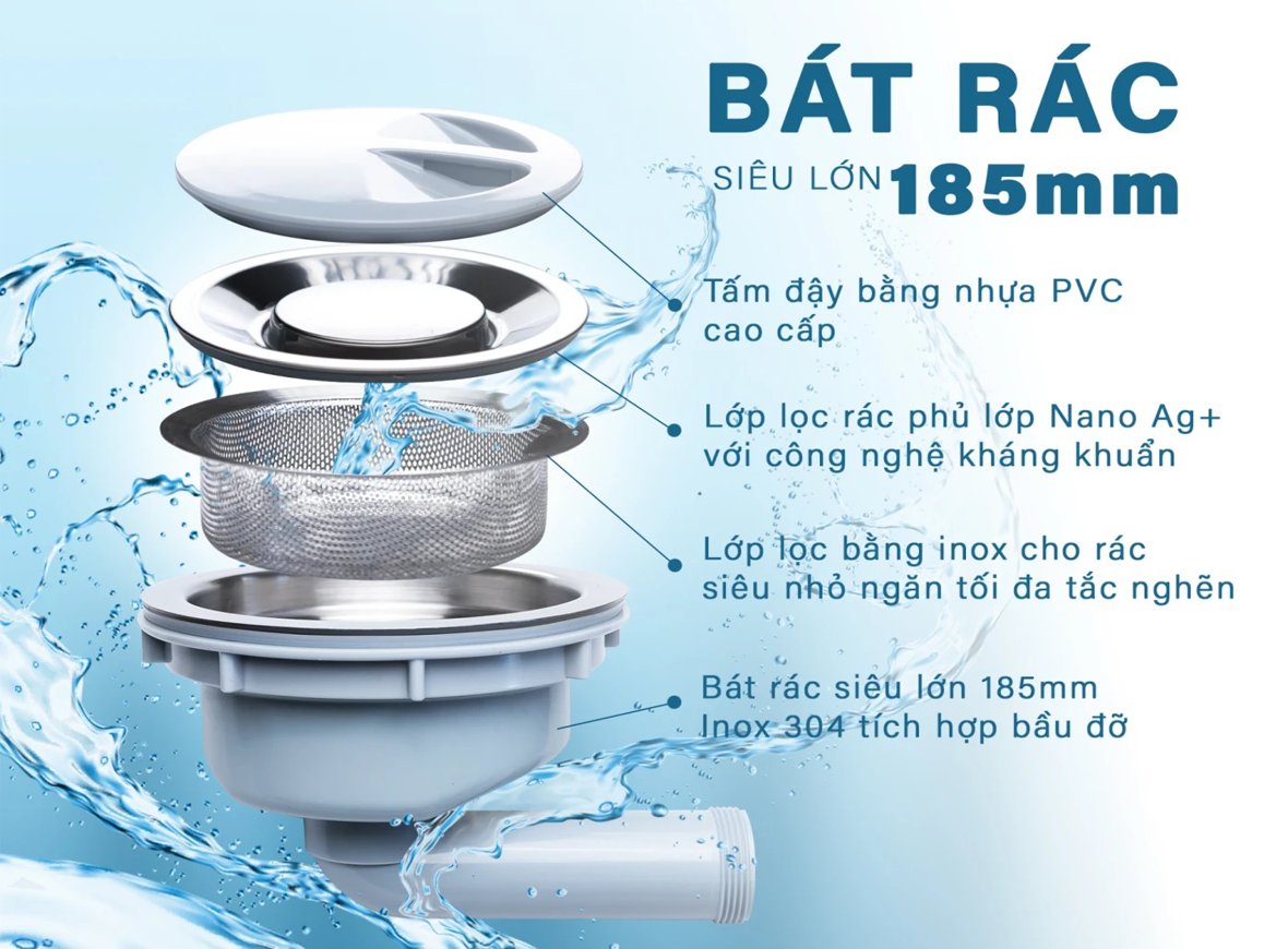 Bát rác cỡ đại 185mm & Hệ thống 3 lớp lọc rác, đỉnh cao tiện nghi