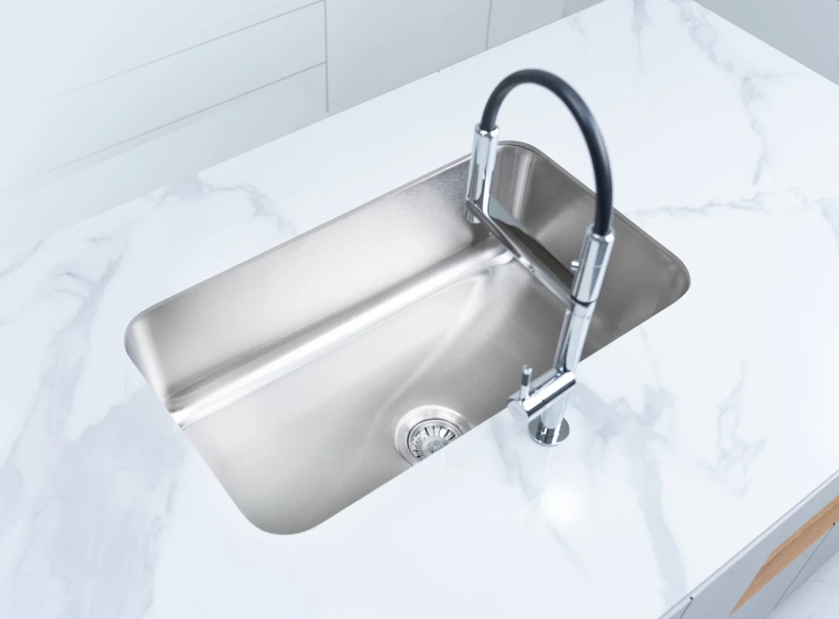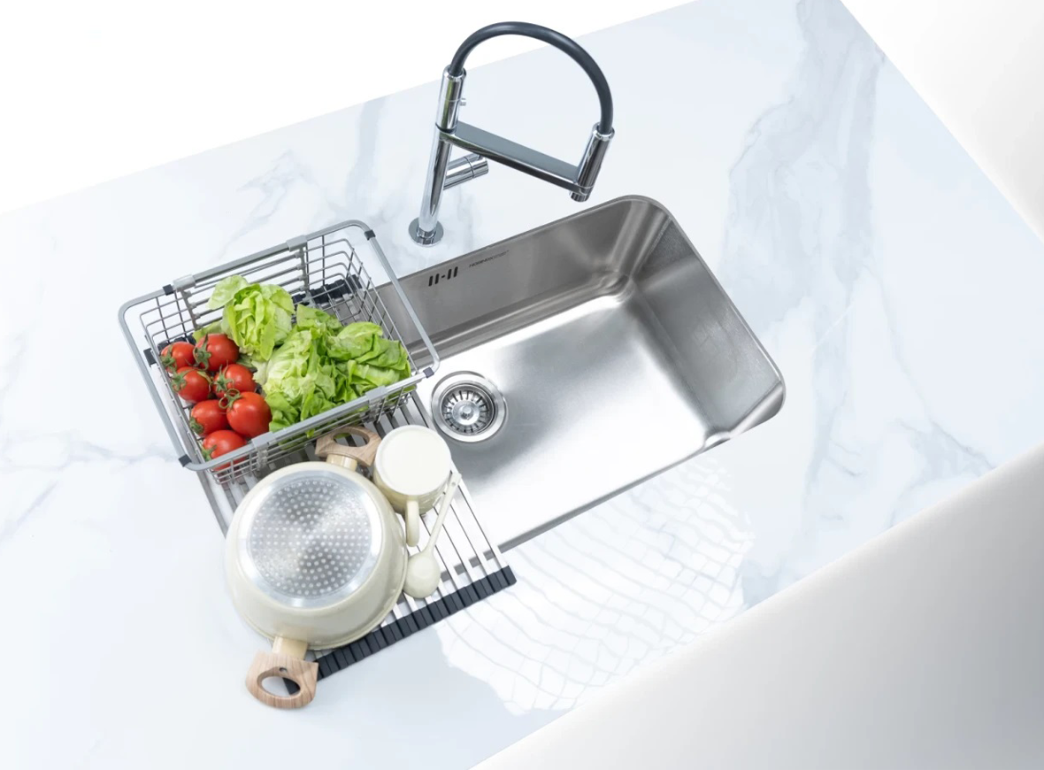 Chậu 1 hố thiết kế với phong cách tối giản, đường nét mềm mại và thanh lịch, phù hợp với mọi không gian bếp.