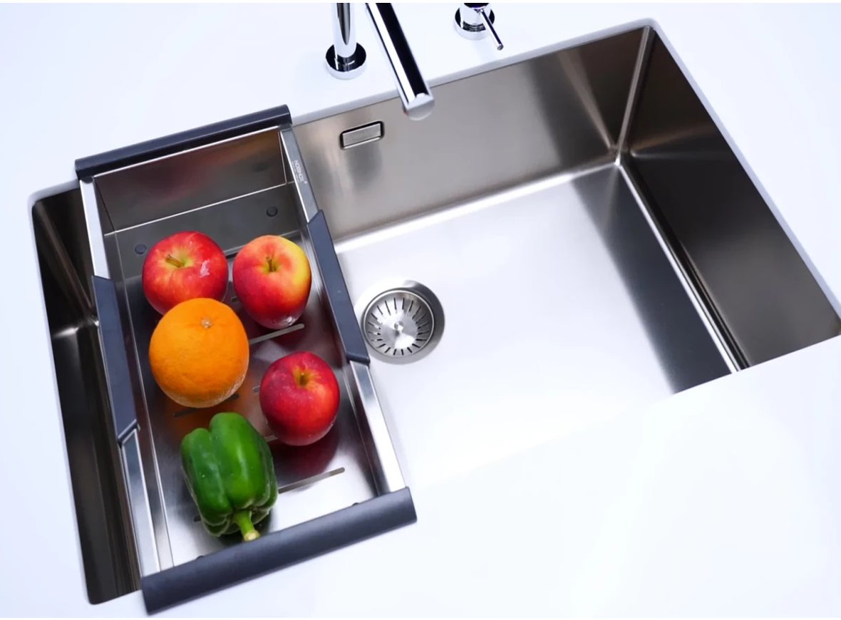Đi kèm với chậu là khả năng tích hợp thêm nhiều phụ kiện bếp (có thể mua riêng), mở rộng đáng kể công năng sử dụng. Bạn có thể trang bị thêm các phụ kiện như thớt nhựa để sơ chế trực tiếp trên chậu, rổ và khay inox để ngâm rửa, phân loại rau củ hoặc bát đĩa một cách tiện lợi. Sự kết hợp giữa thiết kế lắp đặt linh hoạt và hệ sinh thái phụ kiện đa dạng này tạo nên một "trung tâm" làm việc hiệu quả trong bếp, giúp cho mọi thao tác nấu nướng, sơ chế và dọn dẹp trở nên nhẹ nhàng, đơn giản và có tổ chức hơn, từ đó nâng cao trải nghiệm và niềm vui vào bếp cho người sử dụng.