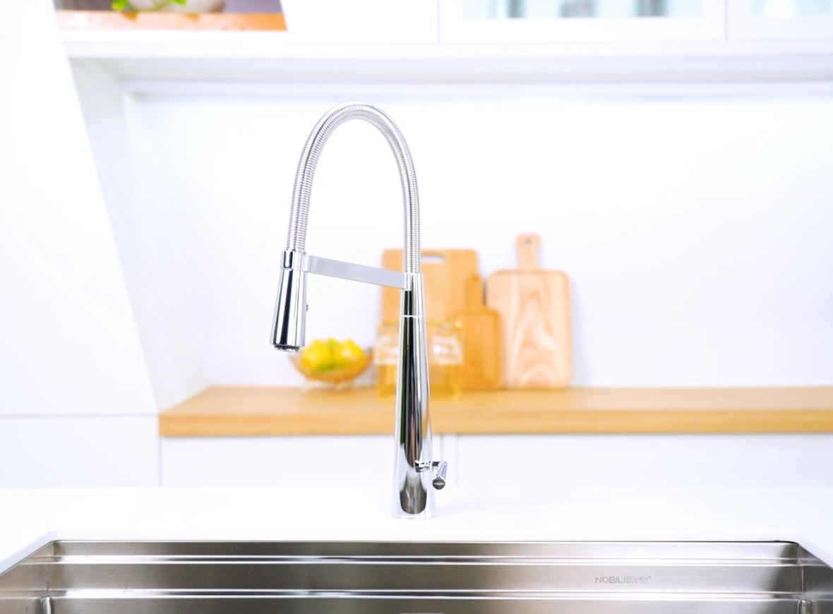 Vòi rửa bát cần mềm NOBILI LIKID NB880 được trang bị thân vòi xoay 360 độ, mang đến khả năng xoay chuyển linh hoạt và phạm vi tiếp cận rộng khắp khu vực chậu rửa. Bạn có thể dễ dàng điều chỉnh hướng dòng nước đến bất kỳ góc nào, giúp việc rửa rau, rửa bát hay làm sạch bề mặt chậu trở nên thuận tiện hơn bao giờ hết. Thiết kế này đặc biệt lý tưởng cho những không gian bếp bận rộn, tối ưu hóa thao tác và tiết kiệm thời gian cho người nội trợ.