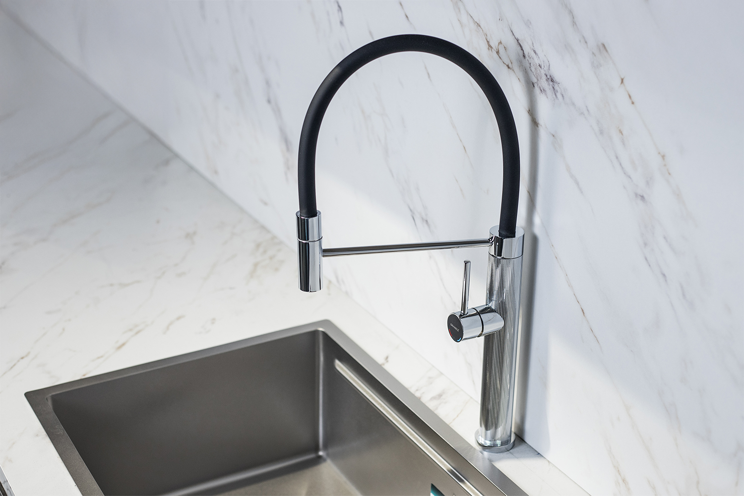 Phần cổ vòi làm bằng vật liệu Silicone cao cấp, có khả năng uốn dẻo linh hoạt giúp người dùng dễ dàng kéo ra – thu vào trong quá trình sử dụng, thuận tiện khi rửa rau củ, xoong nồi hoặc vệ sinh khu vực chậu rửa.