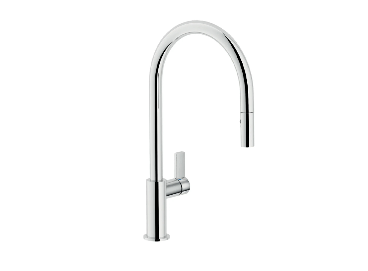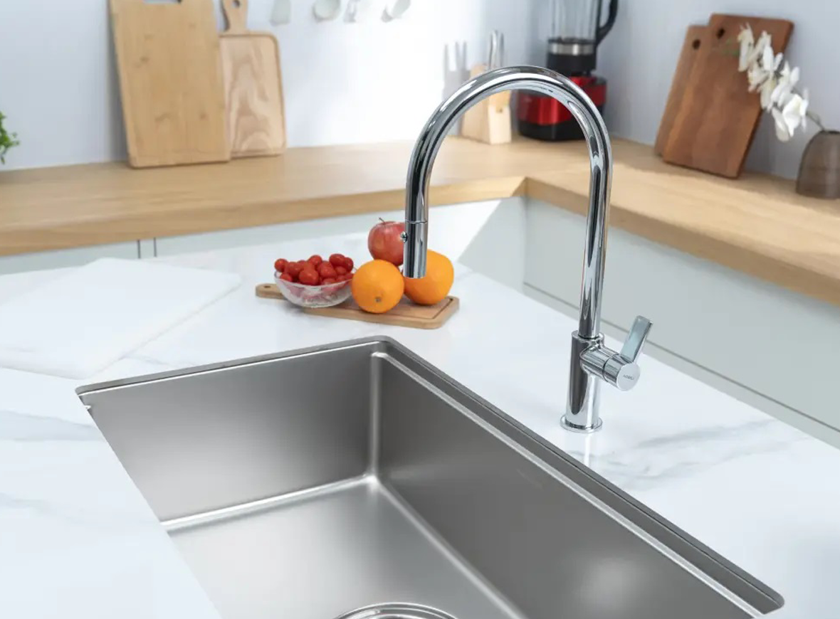 Thiết kế hiện đại, đẹp mắt, hài hòa giữa thân vòi và các bộ phận tạo nên sự thanh thoát. Chiều cao 418mm lý tưởng cho mọi không gian và thao tác bếp.