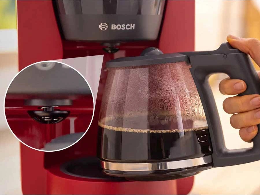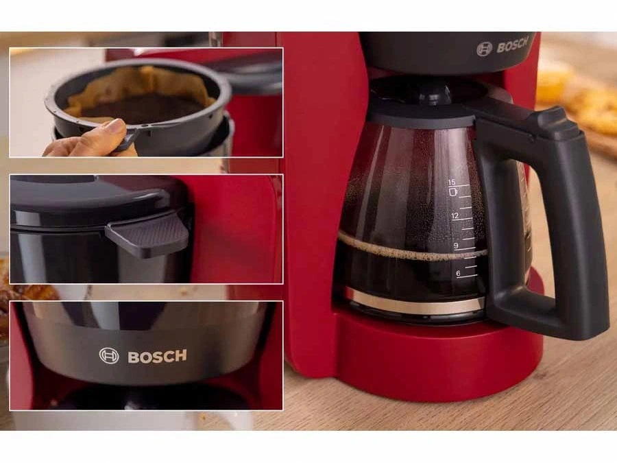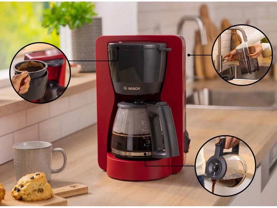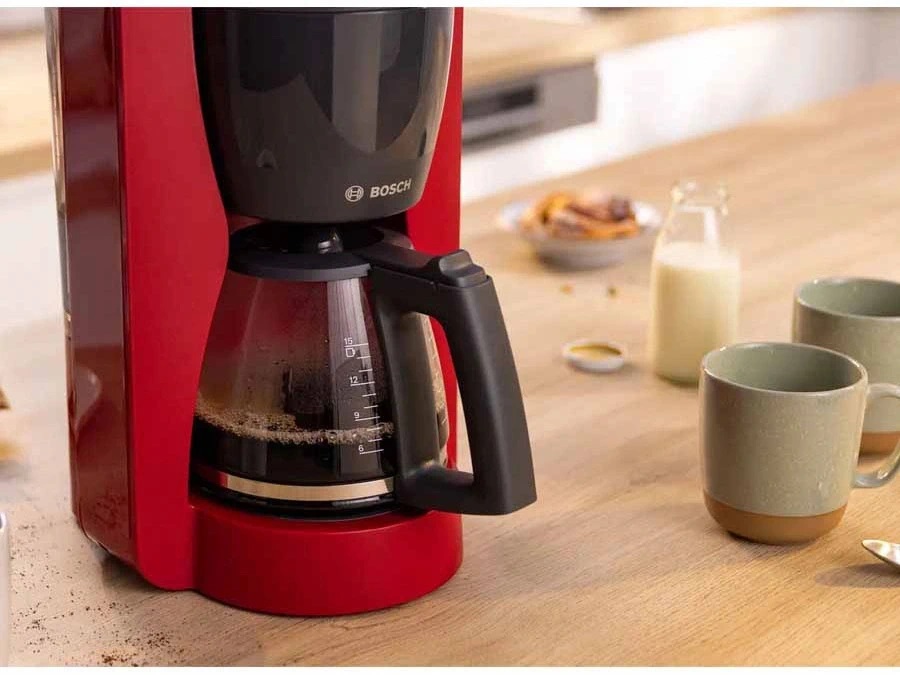 Bên cạnh đó, máy lọc cà phê Bosch được thiết kế với tông màu đỏ nổi bật, tạo điểm nhấn hiện đại cho khu vực bếp hoặc văn phòng. Kiểu dáng tổng thể gọn gàng cùng các chi tiết được bố trí hợp lý giúp thiết bị vừa mang tính thẩm mỹ, vừa đảm bảo sự thuận tiện trong quá trình sử dụng hằng ngày.