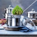 Chất lượng quan trọng nhất của một dụng cụ đun nấu là đáy nồi. Nó đòi hỏi một loại vật liệu hấp thụ nhiệt tốt và phân bố đều trên tất cả phạm vi đun nấu của dụng cụ đó. Đáy nồi 3 lớp TransTherm của WMF bao gồm 1 lớp nhôm nguyên chất dày được ép chặt ở chính giữa hai lớp vật liệu Cromargan ® . Nhôm có những đặc điểm là hấp thu nhiệt rất nhanh chóng và phân bố nhiệt đều ra xung quanh giúp thực phẩm được truyền nhiệt đều từ dưới lên trên và cũng chính vì thế giúp đáy nồi luôn phẳn tuyệt đối trong suốt thời gian sử dụng. Đáy nồi sử dụng công nghệ TransTherm phù hợp cho tất cả các loại bếp, (bếp điện,bếp từ,bếp ga…) đặc biệt phù hợp cho các loại bếp từ, bỏi vì vật liệu kim Cromargan ® đã được chứng minh là có khả năng nhiễm từ tốt nhất trong các vật liệu cùng chủng loại.