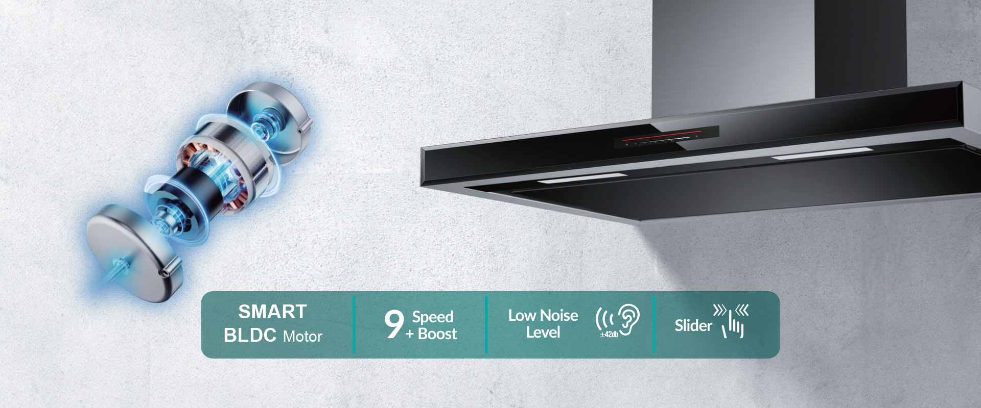 Hút mùi GX H90IL89X được trang bị bảng điều khiển Slider và Sensor Touch Smart với 9 tốc độ, cho phép người dùng tùy chỉnh linh hoạt theo nhu cầu nấu nướng.