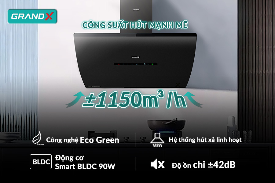 Công suất hút mạnh mẽ: Lưu lượng hút lên đến ±1150m³/h, loại bỏ nhanh chóng mùi hôi và khói bếp.