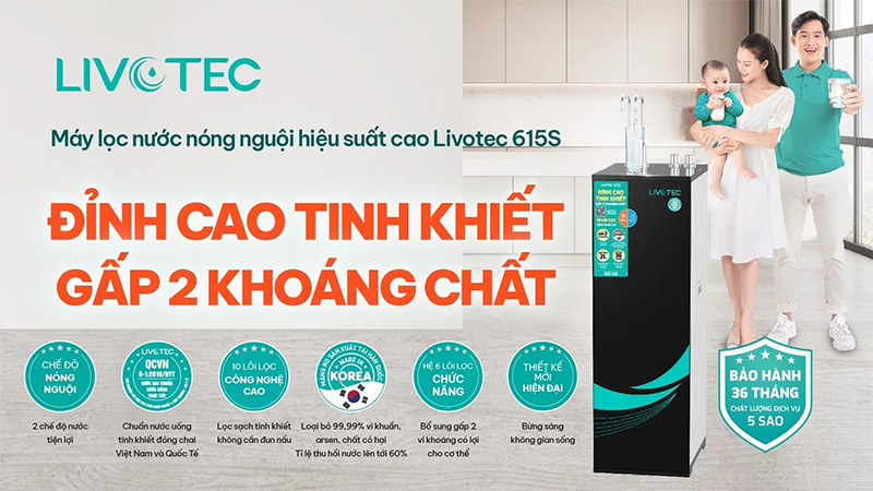Máy lọc nước nóng nguội Livotec 615S – lựa chọn thông minh cho cuộc sống hiện đại. Tích hợp hai chế độ Nóng – Nguội tiện lợi, đồng thời bổ sung gấp đôi khoáng chất thiết yếu, máy lọc nước Livotec 615S mang đến nguồn nước sạch tinh tiết, dồi dào khoáng chất và bảo vệ sức khỏe cho cả gia đình.
